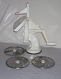 The Super Shredder has 3 different disks for variable slicing and grating. The large slicing disk is for slicing potatoes, carrots, onions, cucumbers, beets, apples, and other fruits and vegetables. This blade reverses for french fry cuts. The medium grater disk is for coarse or medium shredding of potatoes, carrots, celery and other vegetables, and it reverses from a very coarse to medium coarse. The other disk is a fine grater for bread crumbs, cheese, nutmeg, nuts, chocolate, carrots, and potatoes. The total height is 10.25 inches and the diameter of the disks are 6.25 inches. Comes with a rubber suction base for stability and the stainless steel blades are machine washable. Made in Italy.
